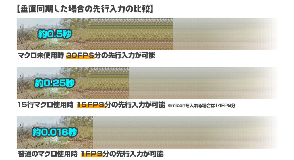 マクロ無しの場合120FPSでも約0.5秒の先行入力が可能です。しかし、15行マクロのFPS120だと約0.125秒の先行入力になってしまいます。グラフィックの描写速度が基準になっているということです。