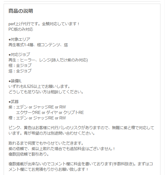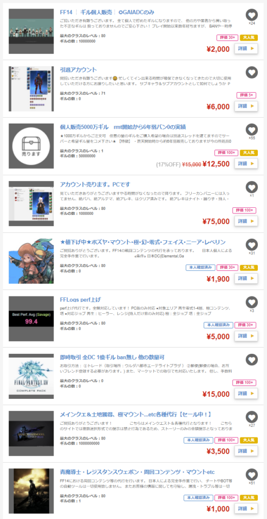 他にも武器取得代行やギル販売、レベリング代行など違法なサービスが蔓延しているFF14の運営はどんな対策をうってるんだろ…って気になりましたね。