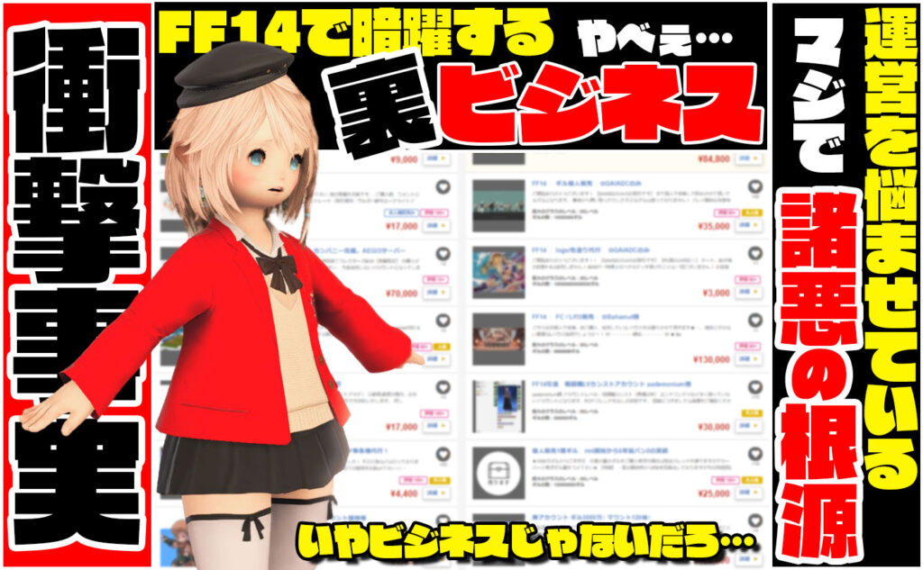 他にも武器取得代行やギル販売、レベリング代行など違法なサービスが蔓延しているFF14の運営はどんな対策をうってるんだろ…って気になりましたね。