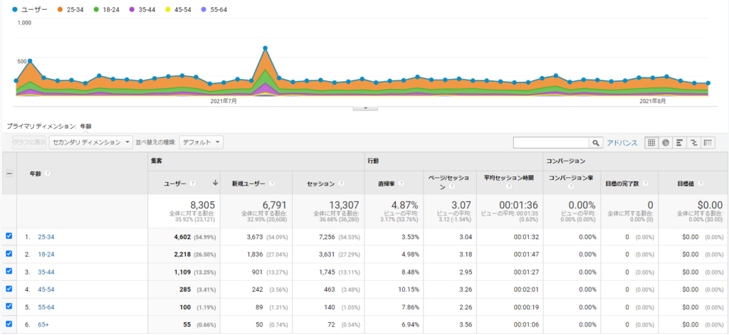 Googleアナリティクスから取得した年齢比と男女比のグラフ