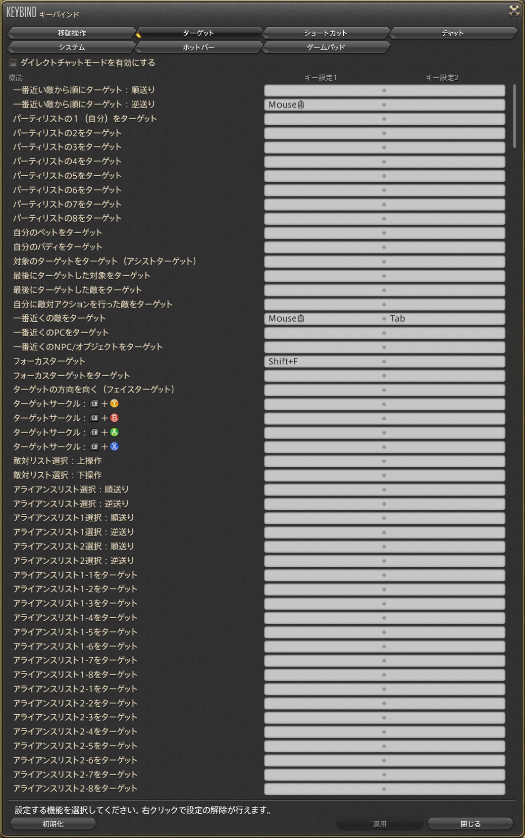 ターゲットは基本的にマウスオーバーで処理しているのでキーバインドは空っぽです。