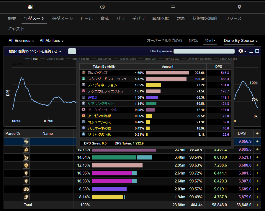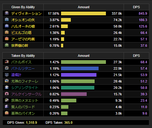 与ダメージの項目でrDPS欄にマウスオーバーすると個々にどれくらいシナジーを貰えているか確認できる。占星術師であれば必ず確認しよう。