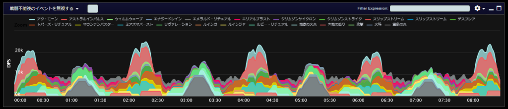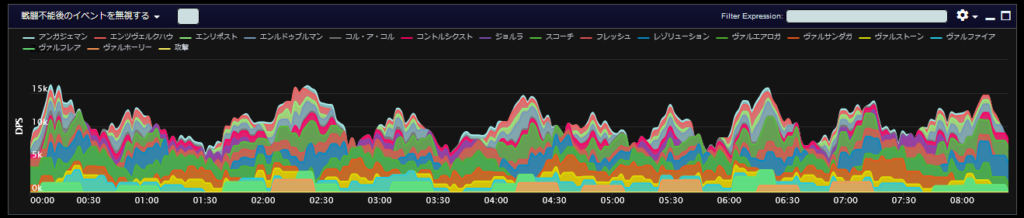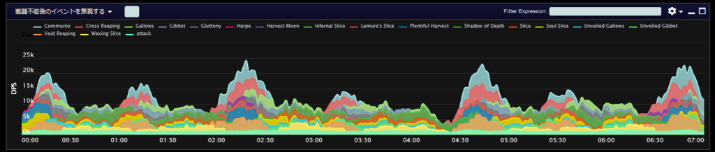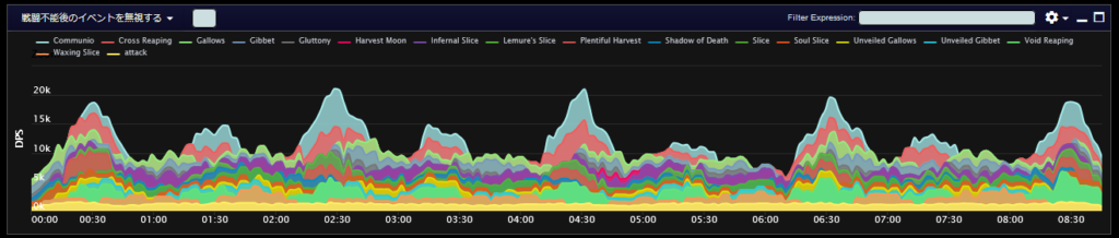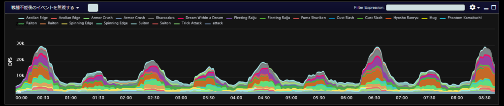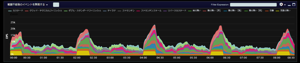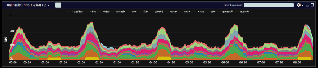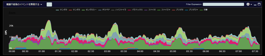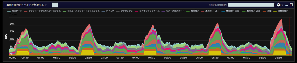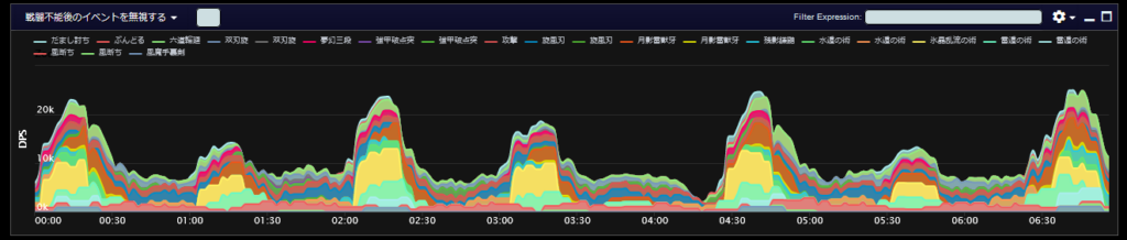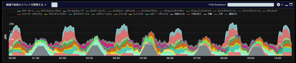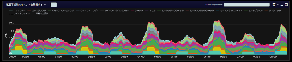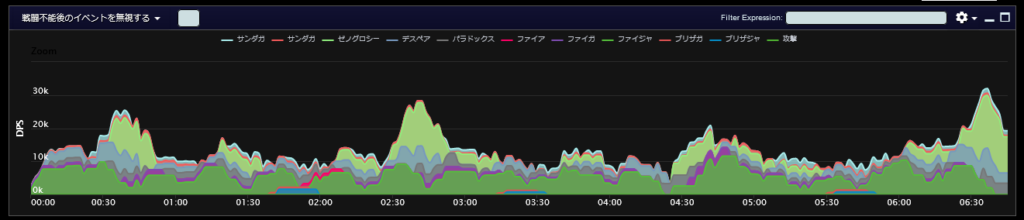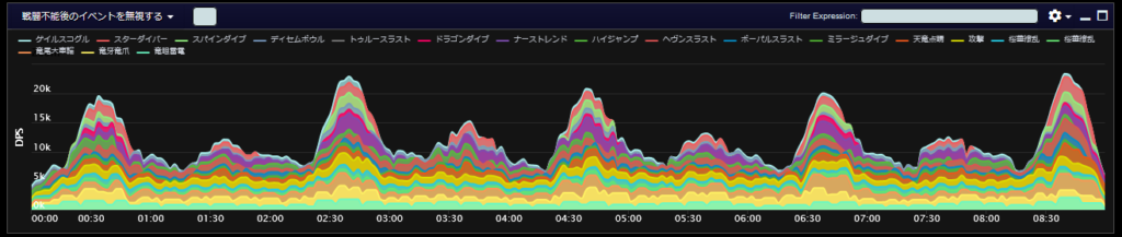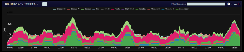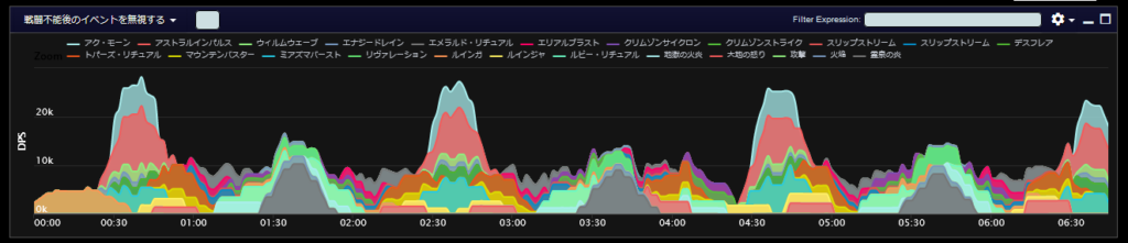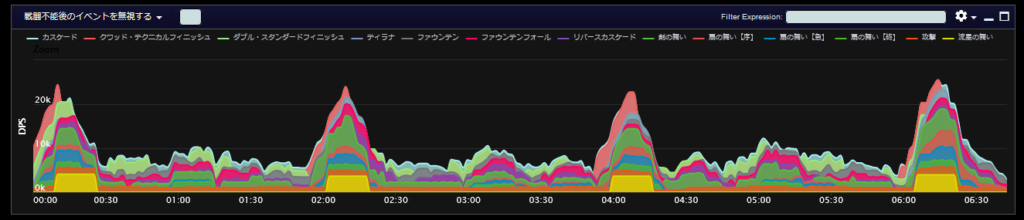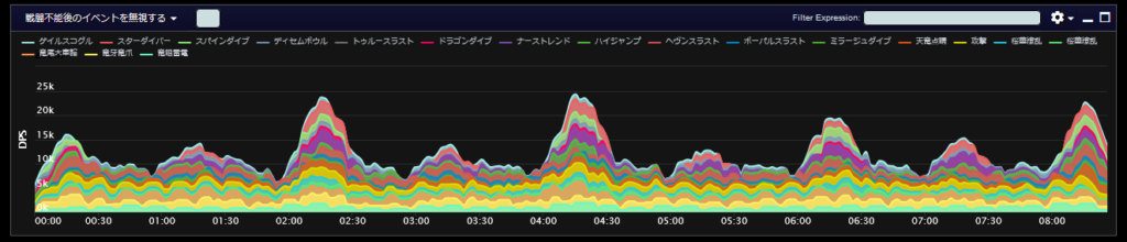 DPSグラフは上位のプレイヤーのログから選んでいますので、かなり上振れを引いているグラフになります。またジョブ構成によってもグラフの波が大きく変わることがあるので本当に参考程度にみてください。