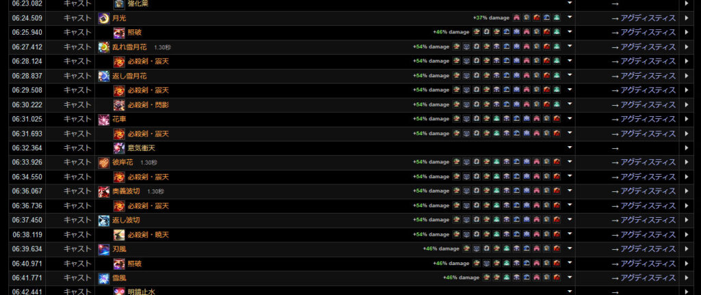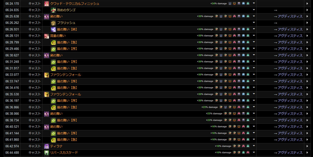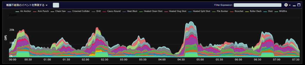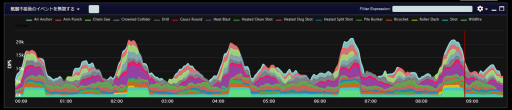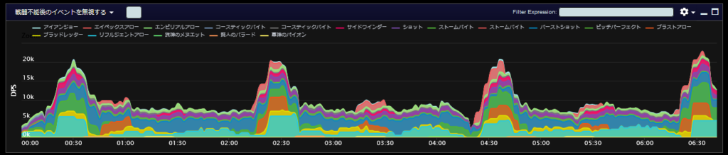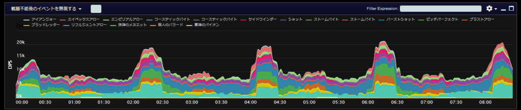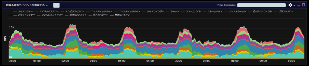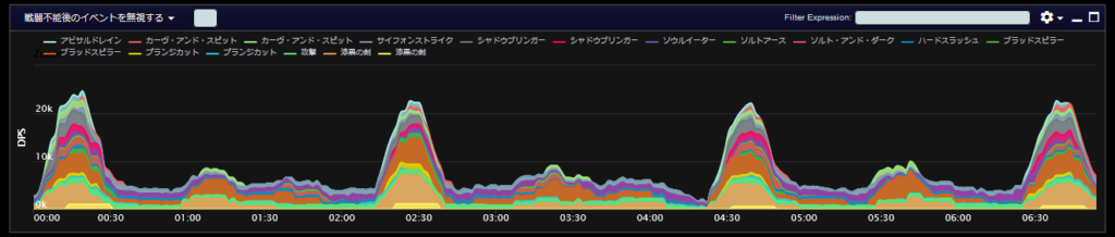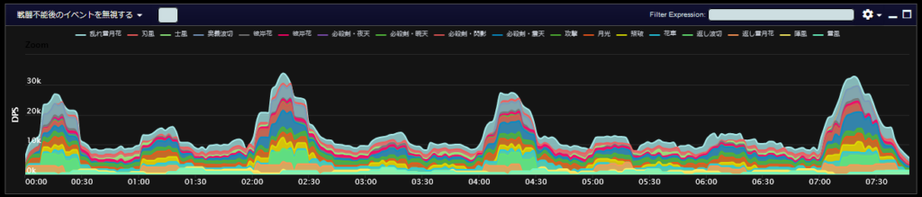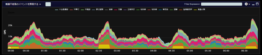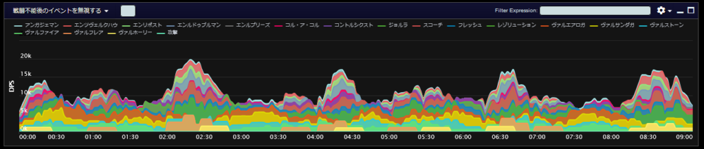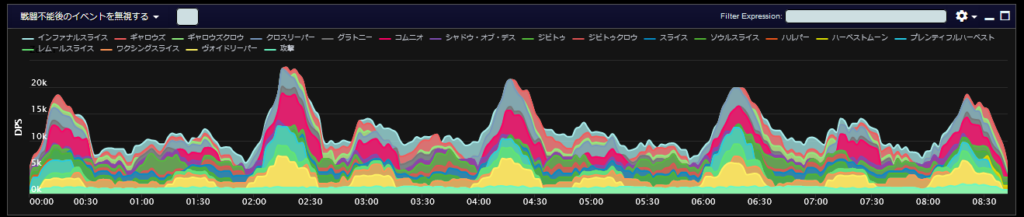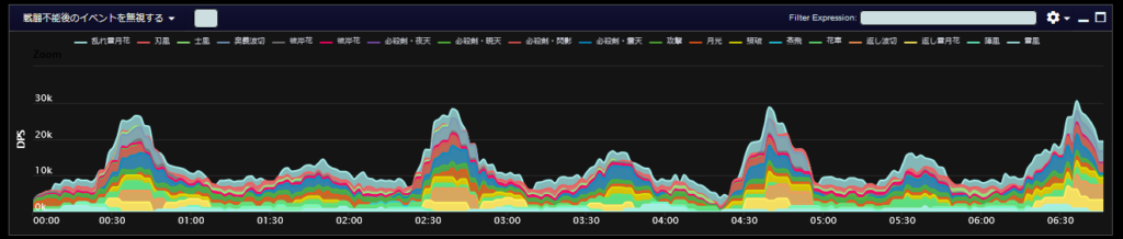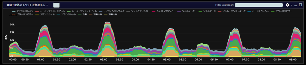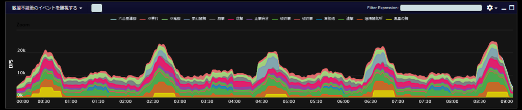 DPSグラフは上位のプレイヤーのログから選んでいますので、かなり上振れを引いているグラフになります。またジョブ構成によってもグラフの波が大きく変わることがあるので本当に参考程度にみてください。
