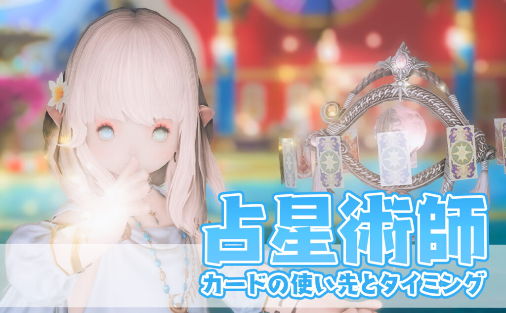 占星術師をしている皆さんには「カードを投げてみんなを支援したい!」「エフェクトがキラキラしているから可愛い!!」「カード投げてちやほやされたい!!!」みたいな意見が多いですが、私の入っている固定では「ディヴィと同時に侍にカード投げて2枚目に近接引いたら暗黒に投げて」「彼岸花と返し、震天4回と照破に乗せるから彼岸効果時間残り14秒でよろしく」みたいな感じなので、秒刻みに投げれるように頑張りましょう。