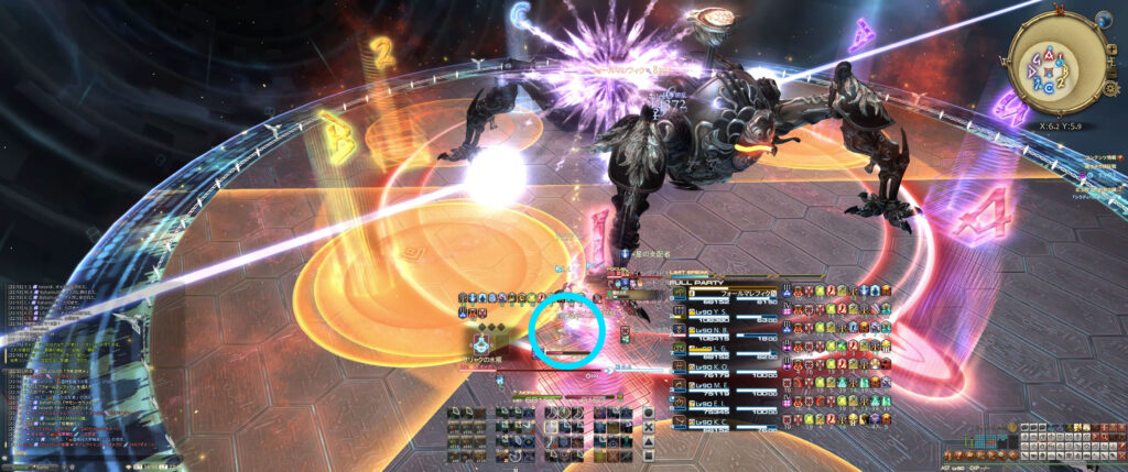 2番目の踊り子と赤魔道士が塔処理で、線の処理は4番のナイトと占星です。それぞれの優先順位で処理していきます。ほかの人はAOEに巻き込まれないように注意してください。