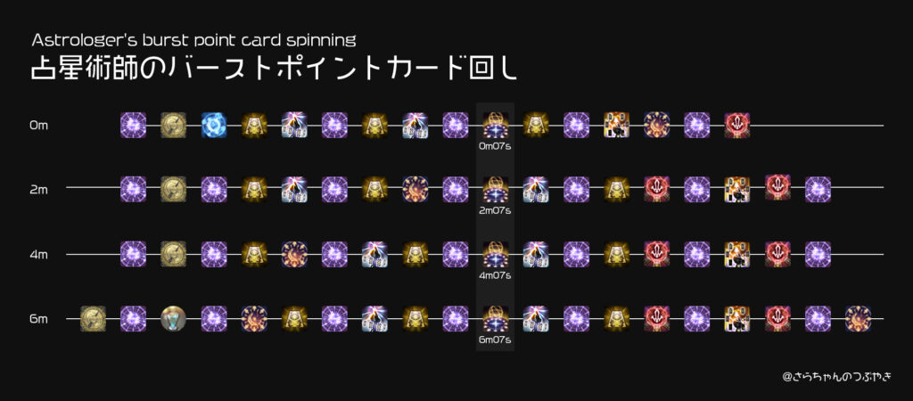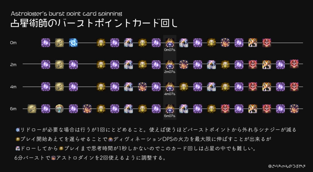 あとは1分毎のDPSのプチバーストにカードを合わせるように練習しましょう。占星術師は他ジョブへの理解度も必要になってくるジョブですが、