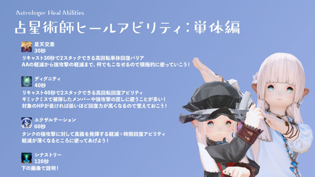 話が逸れてしまいましたが、占星術師のアビリティヒールは60秒で回るアビリティがほとんどです。