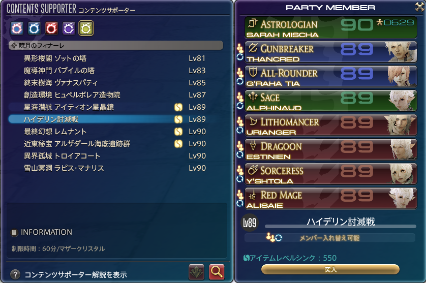 まだ操作が慣れていないうちはコンテンツサポーターを使い練習します。ハイデリン討伐戦は唯一NPCと8人パーティが組めるので誰にも迷惑をかけることなく練習できます。