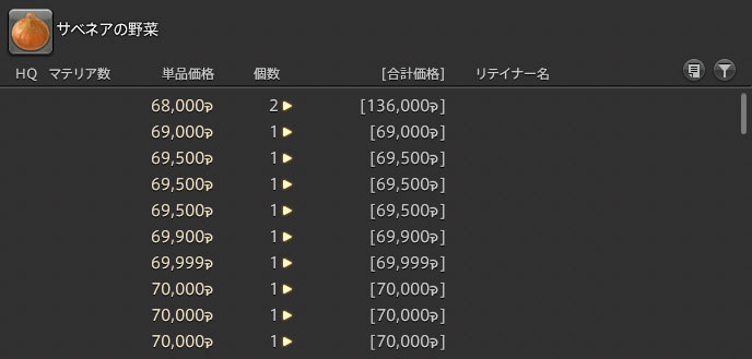 ランク20までサベネアの野菜は10個必要で、畑で栽培するかマーケットボードで買うことが可能。1個あたり70,000ギルくらいが相場です。