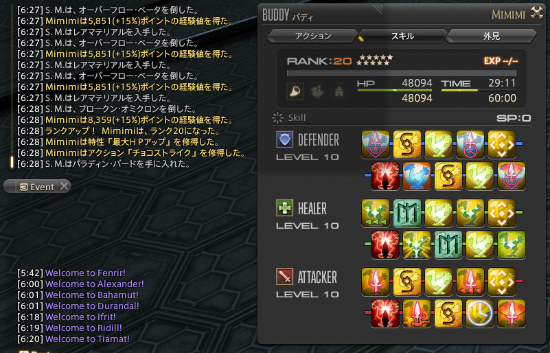 FATEの制限時間が約15分+1分、フルでやればバディに経験値が60~70万(バディのレベルによって上昇する)くらい入ります。クリーエの野菜を好物にすれば+15%の経験値が入り、もし狩場がホームワールドであればFCアクションのバディ経験値Ⅱを使うことで合計30%のブーストをかけることができます。